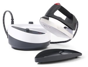 Kvalitetna parna postaja v priročnem plastičnem ohišju, enostavna za uporabo, z vgrajenim navijalcem napajalnega kabla in snemljivim odlagališčem likalnika.
