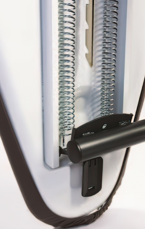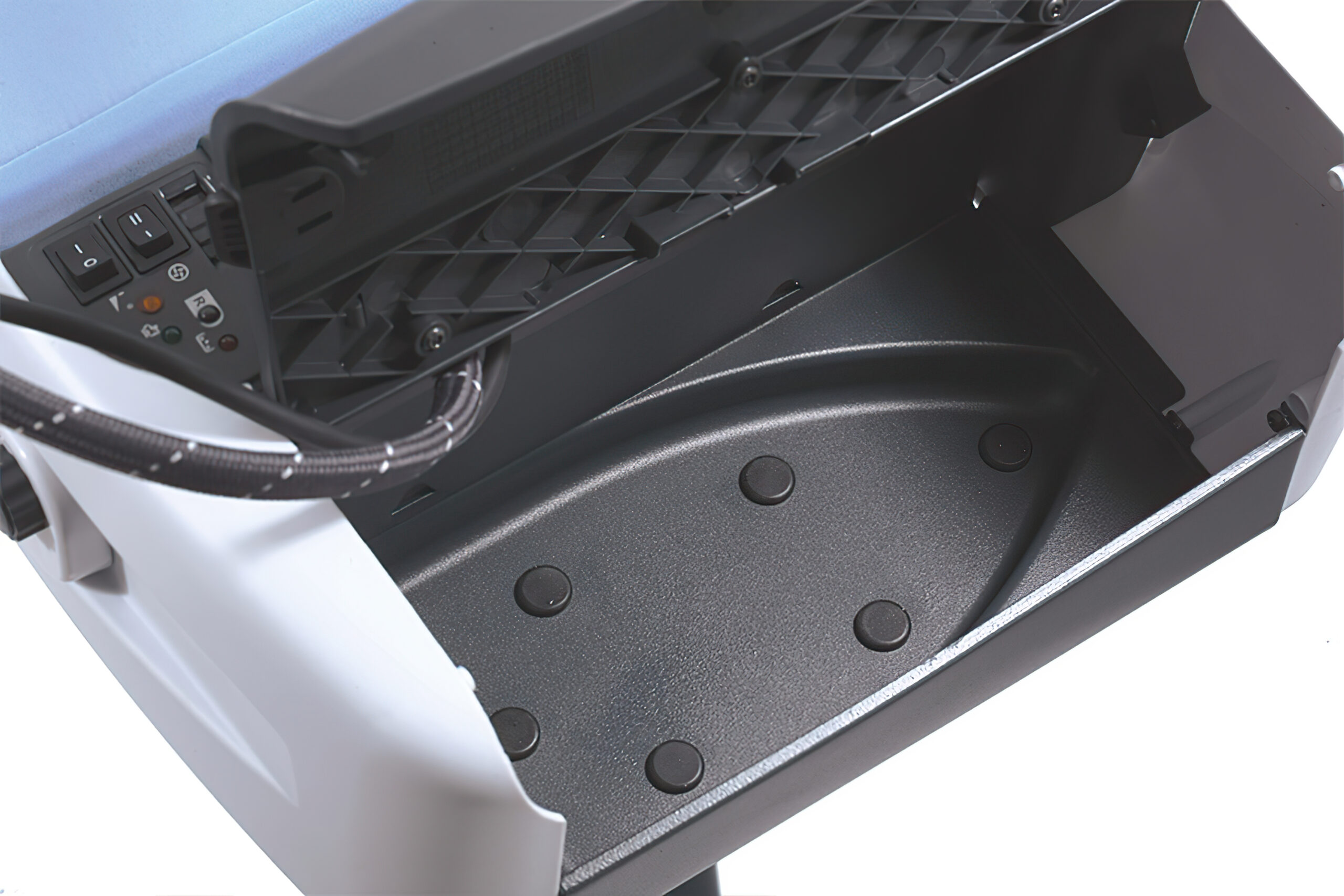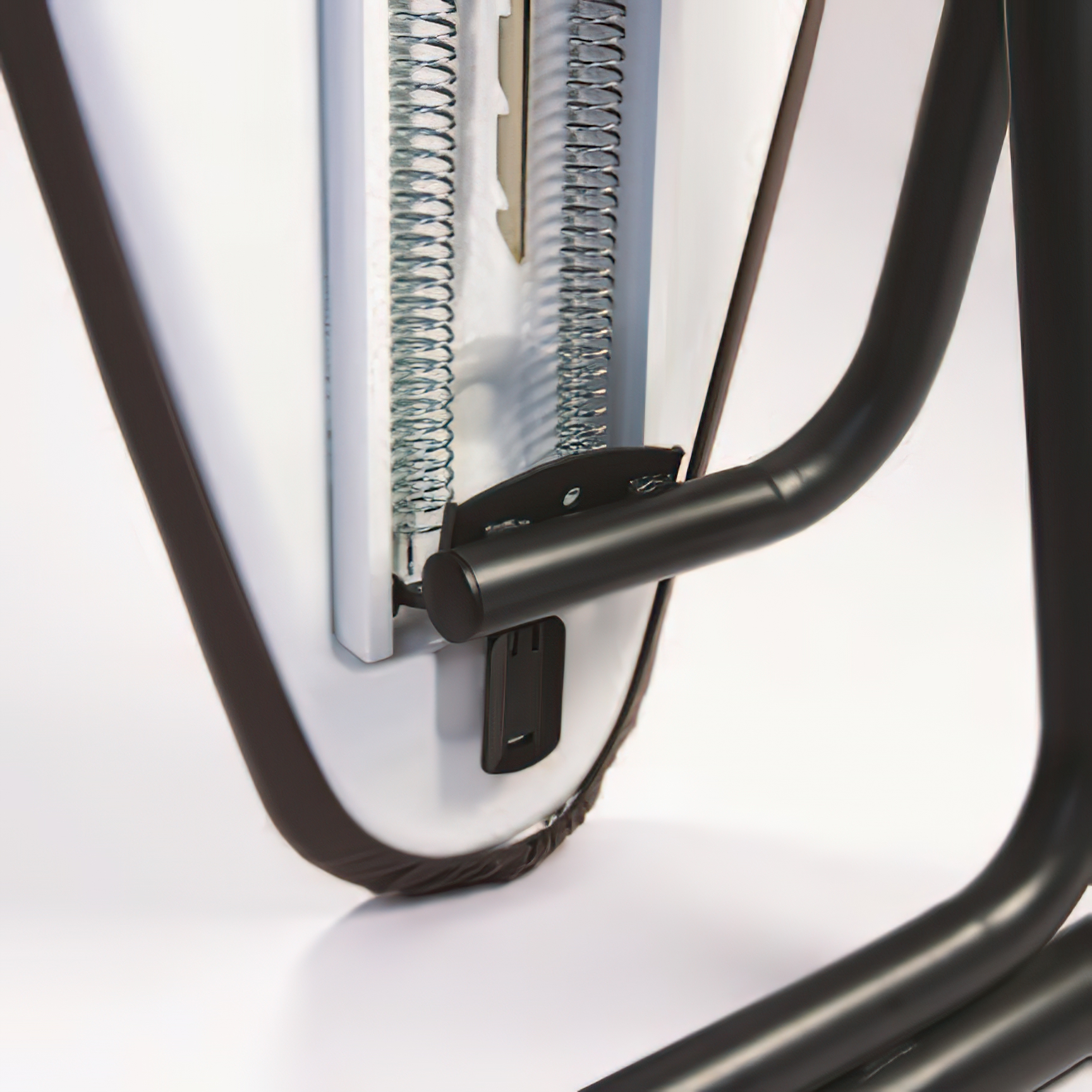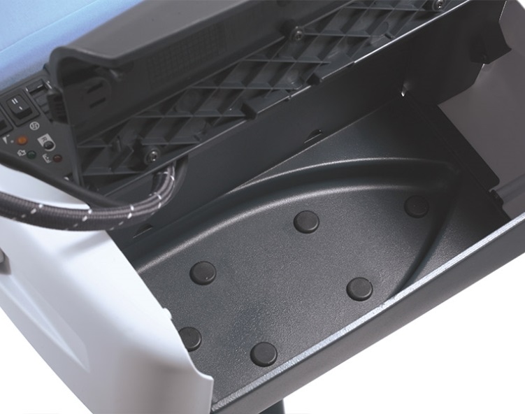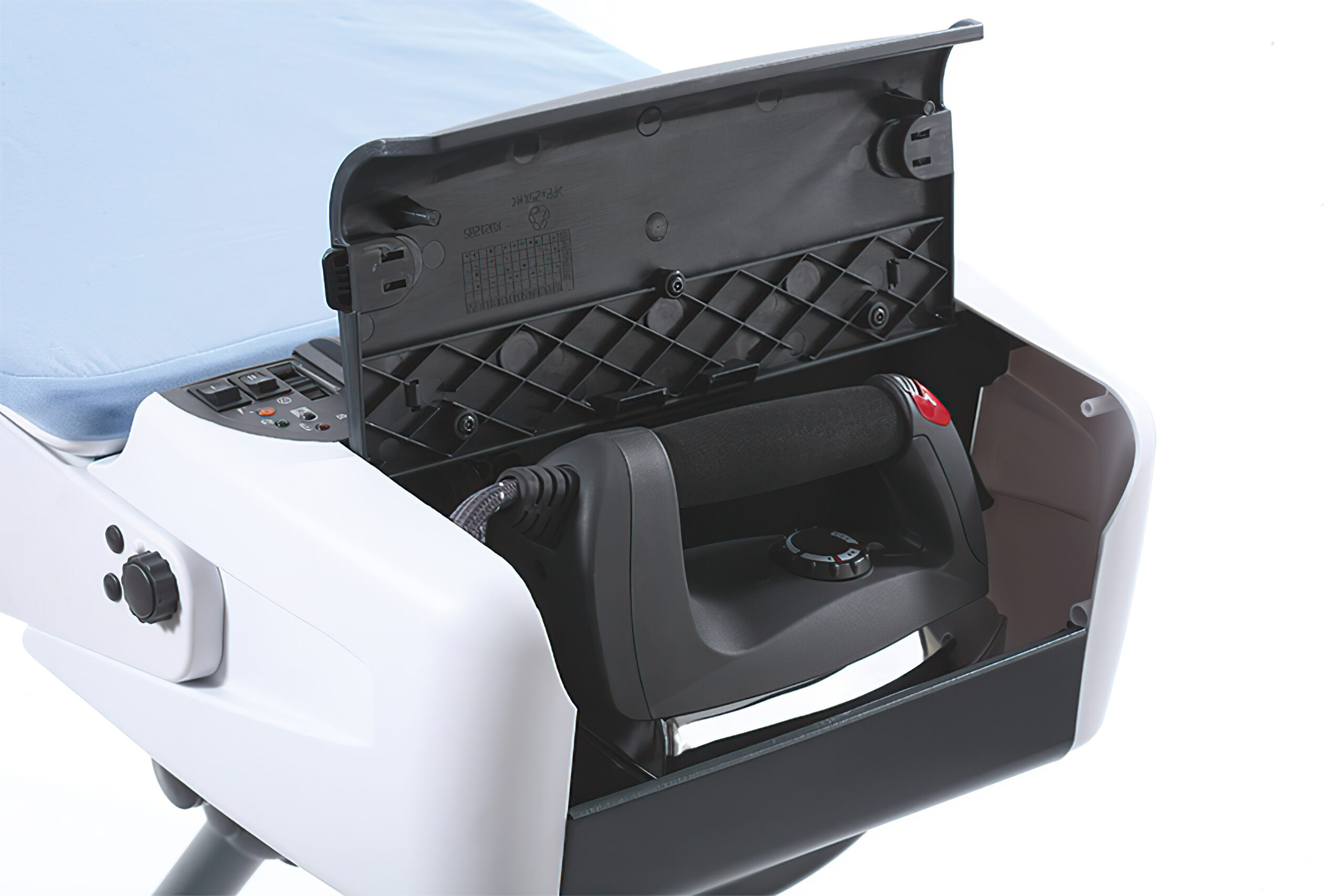 Enostavna postavitev na odgovarjajočo višino s pomočjo dveh vzmeti s kompenziranjem za lažje dvigovanje, izjemno stabilna konstrukcija z namenskim varnostnim sistemom pred neželenim odpiranjem, spravljanje v pokončni položaj, vgrajeni predal za hrambo likalnika in dvojna kolesa za olajšan transport.